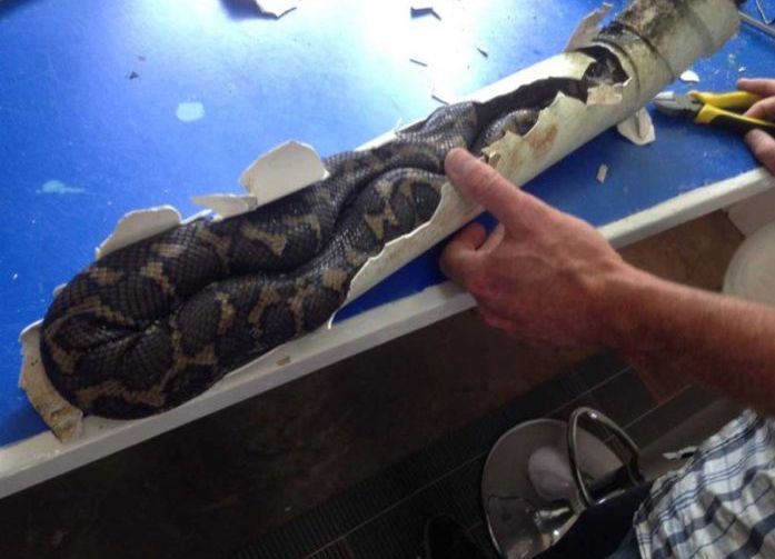Let me ask you a quick question before we start – did you know that snakes can invade homes and get into very tight spaces? Well, the answer is yes and this makes finding them and removing them a real struggle sometimes. When the house was having its pipes replaced, it set off a chain of events that eventually lead to the saving of a life. It’s a situation that is common in areas with snakes, and unfortunately these incidents don’t always turn out the best for the animals involved. C This Coastal Carpet Python found himself in a really tight spot, literally and figuratively. This snake was slowly slithering its way up the side of the house through the drainage pipes. It tried to make a U-Turn and found itself in a position that even a snake couldn’t slither out of.