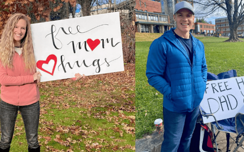 Following an emotional encounter with a bereaved teenager at church, a North Carolina mother decided to offer the community a beautiful feeling that cannot be bought with money. Jordan Roten created signs that read, “Free Mom Hugs,” “Free Dad Hugs,” and visited a local university campus with her husband.