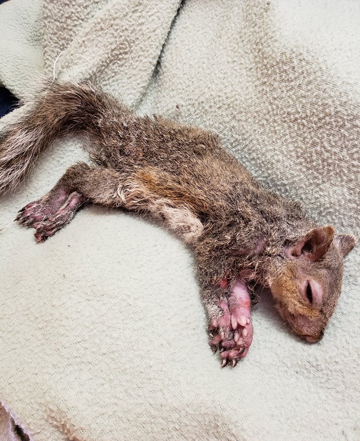 That worked. Underneath it became clear this was not a dog or a cat – but a squirrel (SEE PHOTO). “It took about an hour. There were some patches of fur gone and some abrasions on his skin, but in the end, he didn’t look too bad!” Dr. Eagan said. When the squirrel woke up, he was much happier. Since he was otherwise in great shape, Dr. Eagan set him free. “He was pretty excited to get out of the clinic and up to a tree. If it hadn’t been for those teenage boys, he would not have lived.”- Dr. Eagan.