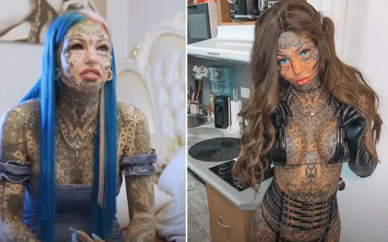 Amber, who is a body modification enthusiast, posted a never before seen photo of herself before she underwent a $120,000 head to toe transformation. She reportedly spent $50,000 on about 600 tattoos, including having blue ink injected into her eyeballs in a 40 minute procedure that blinded her for three weeks. She also spent $70,000 on various extreme body modifications including cheek and lip fillers, tongue split, pointed implants in her ears, breast augmentation, and a Brazilian butt lift.
